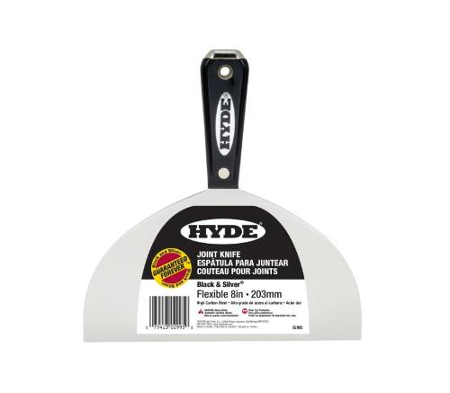 8″ Flexible blade with desired flex point for applying and smoothing compound and taping joints. Black & Silver® joint knife with high carbon steel blade. Durable nylon handle with Hammer Head® end for setting popped nails and screws as you work. Full-tang blade.